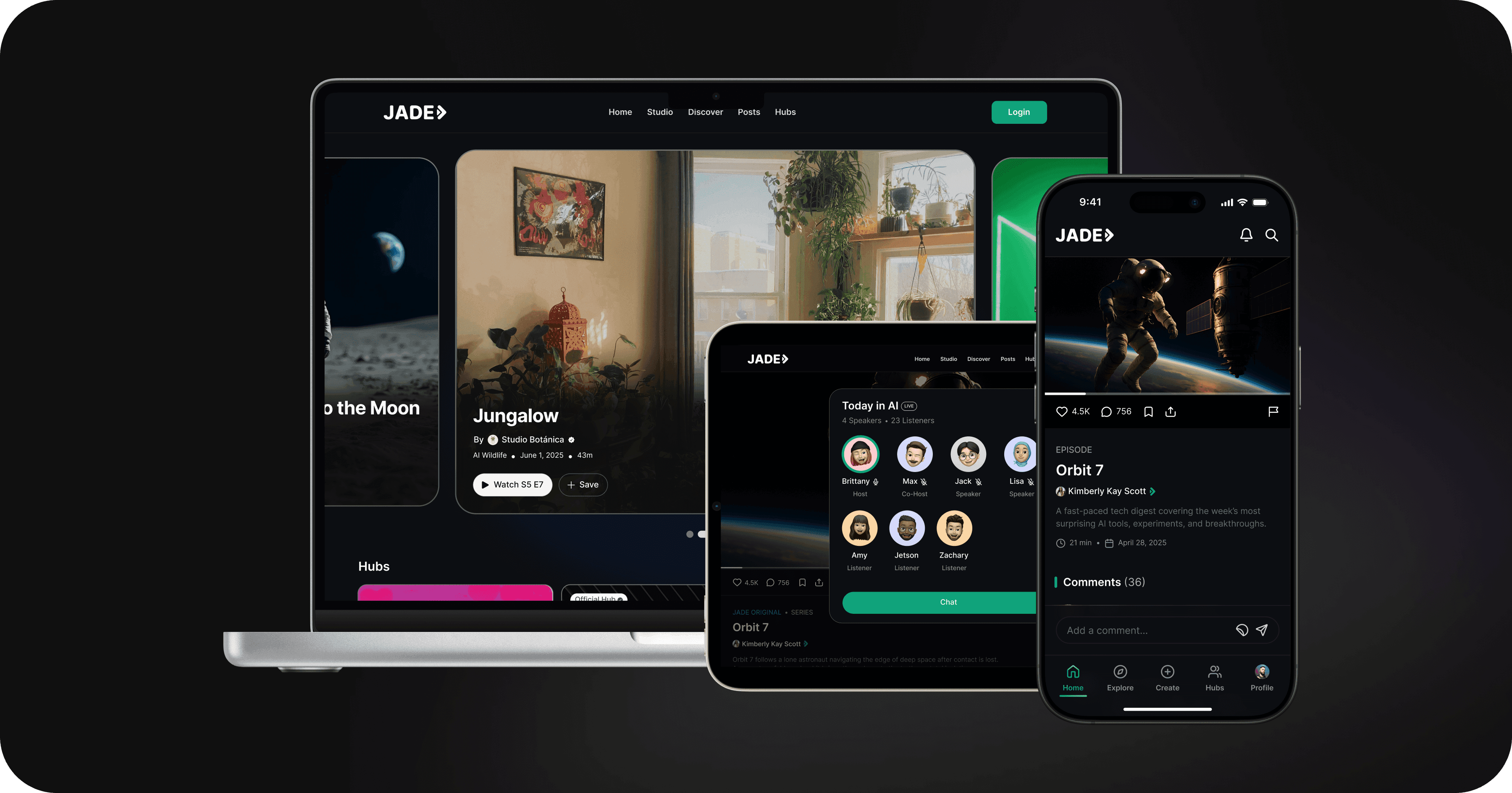 JADE AI is an iOS app for creating, watching, and sharing short-form series and videos, where I was the lead designer responsible for the UI, app icon, and in-app copy.
